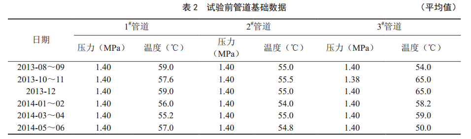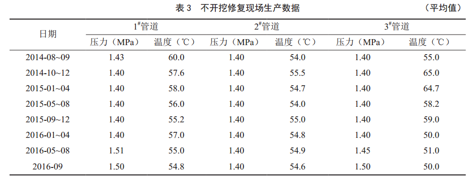 根據(jù)內(nèi)翻襯玻璃鋼軟管修復(fù)技術(shù)原理,完成3條摻水管道不開(kāi)挖修復(fù)施工(圖 4)。經(jīng)運(yùn)行25個(gè)多月,管道日常生產(chǎn)運(yùn)行平穩(wěn),平均摻水壓力保持在0.1 MPa正常波動(dòng),從現(xiàn)場(chǎng)實(shí)際生產(chǎn)數(shù)據(jù)可以看出不開(kāi)挖修復(fù)內(nèi)襯軟管能夠滿足油田生產(chǎn)需求(表 3)。