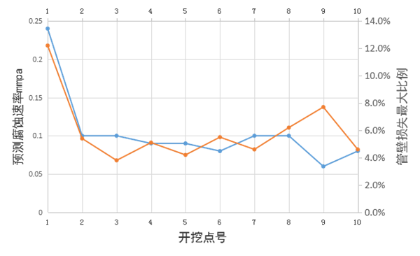 由于目前油田集輸管線一般不進(jìn)行基線檢測(cè),缺少管道原始壁厚數(shù)據(jù),無(wú)法計(jì)算管壁的實(shí)際腐蝕速率,預(yù)測(cè)的腐蝕速率又難以直接和壁厚損失進(jìn)行對(duì)比。因此將兩者趨勢(shì)進(jìn)行了對(duì)比,如圖 2所示。從圖中可以看出,管道沿程預(yù)測(cè)的內(nèi)腐蝕速率與實(shí)際開挖的10個(gè)點(diǎn)測(cè)得的最大壁厚損失在趨勢(shì)上總體吻合。在管道的入口處,管壁的內(nèi)腐蝕風(fēng)險(xiǎn)程度最高,實(shí)際開挖過(guò)程中最大管壁損失超過(guò)了12%。隨著向管線下游延伸,預(yù)測(cè)的內(nèi)腐蝕速率和實(shí)際檢測(cè)的最大壁厚損失均呈減小的趨勢(shì),預(yù)測(cè)的腐蝕速率從入口的0.25 mm/a降至0.10 mm/a,而檢測(cè)的最大管壁損失也從12% 降至4%。這與管道沿程溫度下降、壓力下降導(dǎo)致的腐蝕性氣體分壓下降等因素有關(guān)。 9#開挖點(diǎn)兩點(diǎn)之間存在不吻合,該處的實(shí)際最大壁厚損失出現(xiàn)了上升,達(dá)到了8%。初步分析:該處不是由于制造缺陷導(dǎo)致,而是由于發(fā)生的點(diǎn)蝕所致。已建議管道管理者對(duì)該管段進(jìn)行重點(diǎn)觀察和維護(hù),等換管時(shí)由實(shí)驗(yàn)室進(jìn)行進(jìn)一步檢測(cè)和分析。
