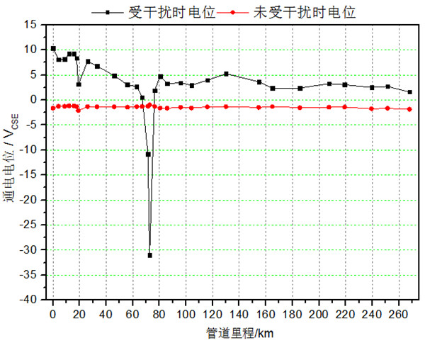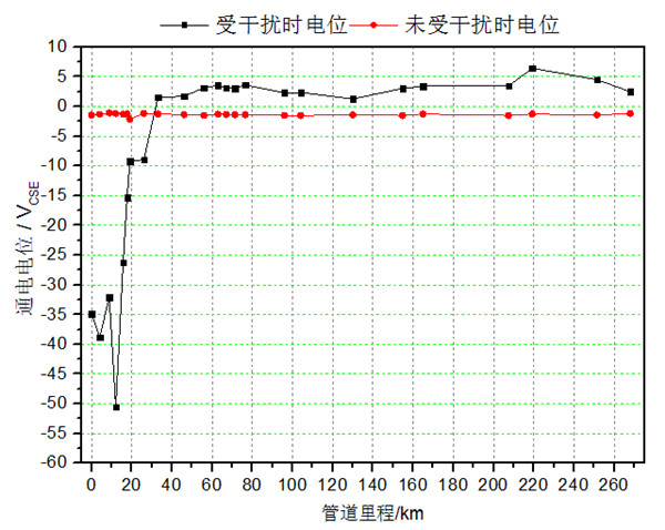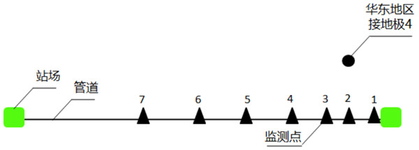 高壓直流輸電工程有兩個(gè)接地極,其中一個(gè)流入電流,另外一個(gè)流出電流。在接地極流入電流時(shí),靠近接地極管道電位正向偏移,遠(yuǎn)離接地極管道電位負(fù)向偏移;在接地極流出電流時(shí),靠近接地極管道電位負(fù)向偏移,遠(yuǎn)離接地極管道電位正向偏移。在接地極附近的天然氣管道上設(shè)置多個(gè)電位監(jiān)測(cè)點(diǎn),分別在離接地極最近位置和遠(yuǎn)離接地極位置同時(shí)設(shè)置,對(duì)管道電位進(jìn)行連續(xù)不間斷監(jiān)測(cè)。通過(guò)同一條管道多個(gè)位置的通電電位同時(shí)發(fā)生正向或者負(fù)向偏移,判斷管道是否受到接地極的干擾。