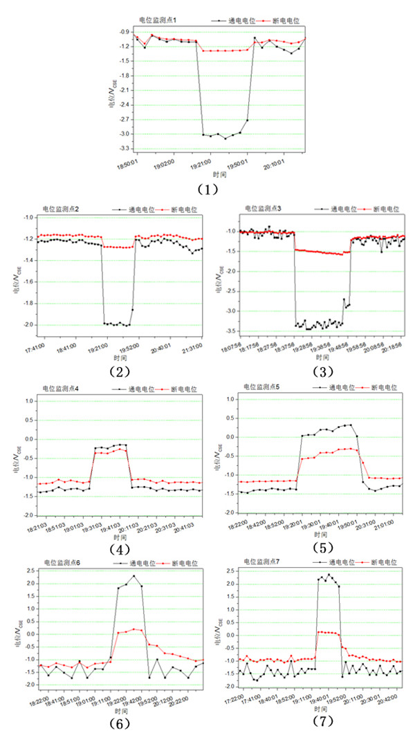 圖 3 管道8的7處電位監(jiān)測(cè)點(diǎn)同一時(shí)間點(diǎn)發(fā)生電位偏移