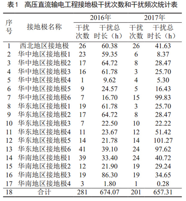 對(duì)全國(guó)17個(gè)接地極附近的12條天然氣管道長(zhǎng)時(shí)間連續(xù)監(jiān)測(cè), 分別得到2016年和2017年的干擾頻次和干擾時(shí)長(zhǎng)(表 1)。 2016年17個(gè)接地極造成干擾次數(shù)281次,干擾總時(shí)長(zhǎng)674.07小時(shí); 2017年干擾次數(shù)201次,干擾總時(shí)長(zhǎng)657.31小時(shí)。對(duì)比兩年的監(jiān)測(cè)結(jié)果可以看出, 2017年的干擾頻次和干擾總時(shí)長(zhǎng)均有降低。華東地區(qū)接地極4和華南地區(qū)接地極4干擾頻次和干擾總時(shí)長(zhǎng)均較。蝗A東接地極4和華南接地極1干擾頻次和干擾總時(shí)長(zhǎng)均較大;華中接地極6、華東接地極5和接地極6干擾總時(shí)長(zhǎng)超過(guò)高壓直流接地極設(shè)計(jì)文件要求的1%(3.65天)故障率。