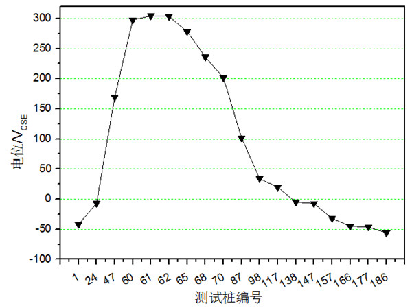 圖 2 管道8的電位監(jiān)測(cè)點(diǎn)和接地極相對(duì)位置示意圖
