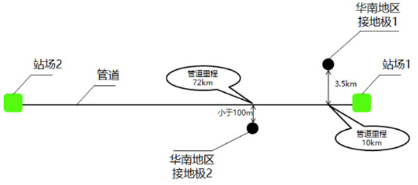 圖 5 華南地區(qū)2個(gè)接地極與管道相對(duì)位置
