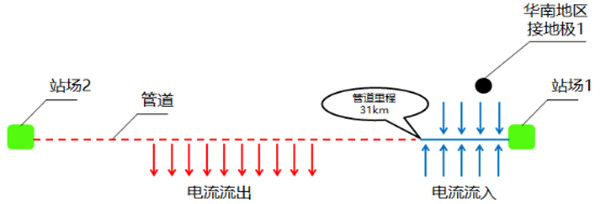 圖 7 管道10受華南地區(qū)接地極1干擾時(shí)雜散流入流出示意圖