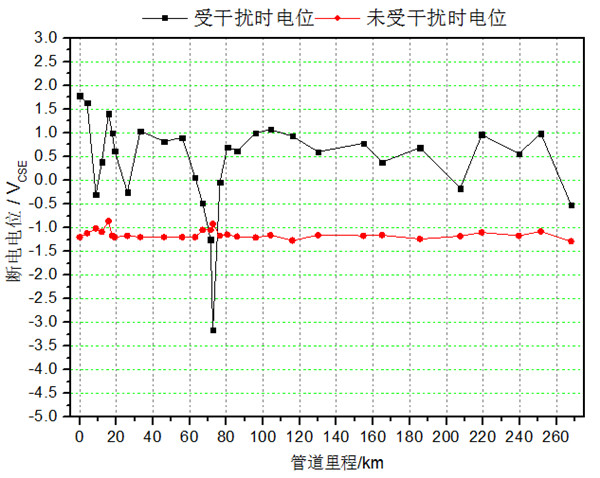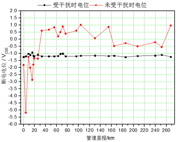 圖 8 管道10受華南地區(qū)接地極2干擾時(shí)通/斷電電位分布圖