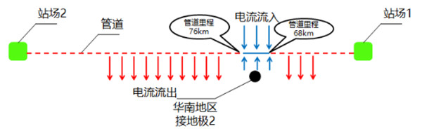 圖 9 管道10受華南地區(qū)接地極2干擾時(shí)雜散流入流出示意圖