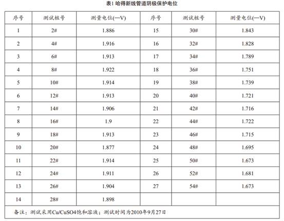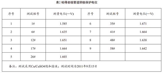 服役初期哈得輸油新老線陰極保護(hù)系統(tǒng)運(yùn)行均正常,但從2004年起哈得新線陰極保護(hù)系統(tǒng)出現(xiàn)異常,分別上調(diào)兩座陰保站恒電位儀輸出,但全線陰極保護(hù)電位仍處于較負(fù)狀態(tài),全線管道陰極保護(hù)電位逐步偏負(fù),管道上陰極保護(hù)電位比恒電位儀輸出電位還負(fù),最終停運(yùn)全線兩座陰保站,但管道陰極保護(hù)電位仍達(dá)-1.8至-2.0v,數(shù)據(jù)見表1。哈得老線陰極保護(hù)系統(tǒng)于2009年出現(xiàn)同哈得新線相同現(xiàn)象,管道陰極保護(hù)電位仍達(dá)-1.5至-1.6v,數(shù)據(jù)見表2。