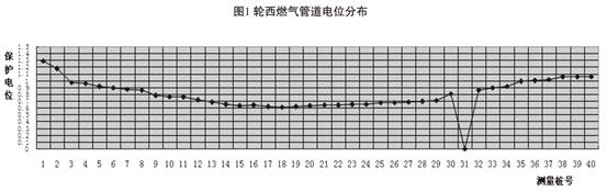 輪西燃?xì)夤艿烙捎诜栏瘜永匣瘜?dǎo)致陰保站中間陰極保護(hù)電位未達(dá)標(biāo)準(zhǔn),見圖1。 2011年12月油氣運(yùn)銷部對該管道使用ACVG法進(jìn)行防腐層破損點(diǎn)檢測,共計(jì)發(fā)現(xiàn)破損點(diǎn)1288處。其中嚴(yán)重漏點(diǎn)11處、中度漏點(diǎn)164處、輕度漏點(diǎn)1113處,防腐層評級(jí)為劣,導(dǎo)致上調(diào)管道兩端恒電位儀輸出,管道陰保站中間部分“欠保護(hù)”一直存在。