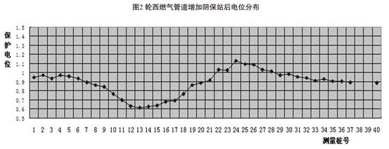 2012年在該管道25#樁處增加一座陰保站,僅使該陰保站兩側(cè)各5公里達(dá)到保護(hù)要求,見圖2,而與兩側(cè)陰保站之間仍存在“欠保護(hù)”,計(jì)劃2013年對該管道全部防腐層進(jìn)行更換,確保管道陰極保護(hù)效果。因此,在管道日常維護(hù)過程中,應(yīng)定期對管道防腐層進(jìn)行檢測,對發(fā)現(xiàn)的破損點(diǎn)及時(shí)修復(fù),防止防腐層整體老化,引起管道大面積電流流失,影響陰極保護(hù)系統(tǒng)正常運(yùn)行。