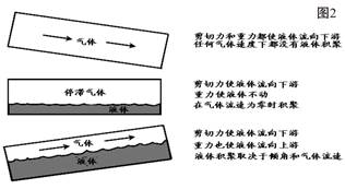 分層流是管道中最主要的液體水傳送機理,任何液滴都會被氣化。 相對于水分, 在氣相中的液滴是不飽和的, 在傳輸過程中會氣化。 液滴具有高的表面/體積比, 液滴表面的氣體流速非常大。 管道中薄膜流驅(qū)動力為流動氣體的剪切力和管道傾角產(chǎn)生的重力。 圖2列出了3種條件下的流動狀態(tài)。 氣液之間剪切力與重力的平衡關(guān)系決定了液體積聚的臨界傾角。 傾角大于臨界傾角的位置容易積聚水分, 傾角低于臨界傾角位置的積液易被帶走, 直到在傾角大于臨界傾角的位置處停留下來。 水分優(yōu)先在第一個傾角大于臨界傾角的位置積聚, 連續(xù)的水分進入且沒有揮發(fā), 使得水分充滿第一個臨界傾角, 然后帶到下一個傾角。