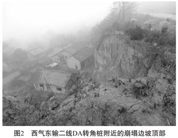圖4為西氣東輸管道3232km+700m里程處的邊坡坍滑體, 管道沿60~70m高的山坡鋪設(shè), 埋深2.4m, 回填土為當(dāng)?shù)氐狞S土狀土, 土質(zhì)松散,雨水浸泡后產(chǎn)生坍滑, 將坡腳擋墻擠毀并越頂堆積于前緣, 致使管道外露并形成危害。