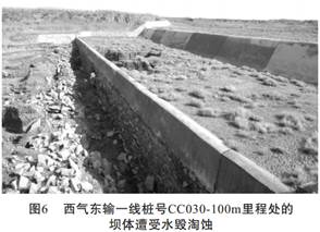 西氣東輸管道在多處河道、 沖溝中以埋入方式通過, 洪水沖毀保護(hù)管道的建筑物的情況每年都有發(fā)生。 圖6為管線在溢流壩體上游穿越通山溝河, 管道埋入河道2~3m, 河道寬80~90 m, 管線下游設(shè)置兩道溢流壩。 目前第二級溢流壩由于水毀已形成較大面積的塌陷, 壩體嚴(yán)重受損, 壩前鉛絲石籠已毀壞, 失去對洪水的消能作用。 若不采取修復(fù)加固工程, 則對壩體上游的管線安全產(chǎn)生危害作用。