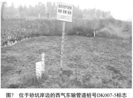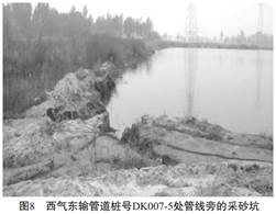 人為活動主要是指亂采、 亂挖, 灌溉水下滲、 爆破震動等, 對管道安全造成危害。 圖7、 圖8為采砂挖砂后形成的地下水匯聚湖塘, 岸邊距管線近10m, 采砂活動一直在進(jìn)行, 岸邊的漸進(jìn)坍塌對管線存在隱患。