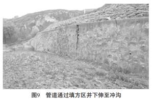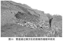 西氣東輸二線管道通過20000m3的棄土填方區(qū), 管道埋入填土內(nèi)4m并下伸到?jīng)_溝, 填土前緣設(shè)置擋墻, 如圖10所示。