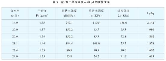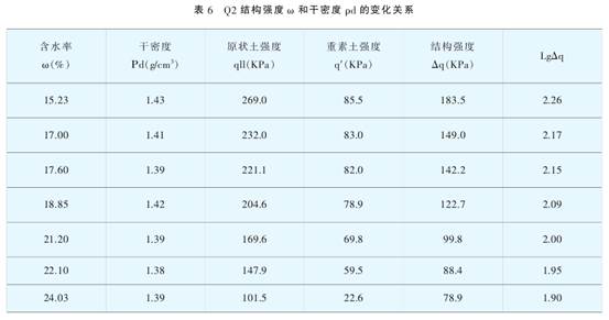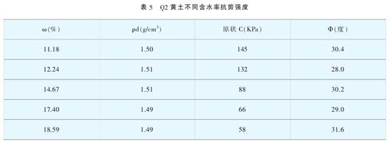 試驗結(jié)果表明Q3,Q2黃土結(jié)構(gòu)強度和抗剪強度與土壤含水率ω。非常密切,由表2可見,Q3黃土的抗剪強度隨含水率增加而降低,當土樣含水率由15.5 %增加到24%時,原狀土樣凝聚力(:值由73kPa降低到20kPa,內(nèi)摩擦角Φ值由28.5°降到13.0°,由表3可見,Q3黃土結(jié)構(gòu)強度隨土壤含水率的增大而急劇降低,土樣含水率由14.0%增加到24%,其結(jié)構(gòu)強度由138.6kPa減小到40.0kPa,土樣平均含水率每增加1%時其結(jié)構(gòu)強度降低約10kPa;由表5可見,Q2黃土的抗剪強度隨含水率增加而顯著降低,當土樣含水率由11.18%增加到23.9%時,原狀土樣凝聚力C值由145kPa降低到24kPa,內(nèi)摩擦角Φ值由30.40降到19.4°,由表6可見,Q2黃土結(jié)構(gòu)強度隨土壤含水率的增大而急劇降低,土樣含水率由15.23%增加到24.03 %,其結(jié)構(gòu)強度由183.5kPa減小到78.9kPa ,土樣平均含水率每增加1%時其結(jié)構(gòu)強度降低約12kPa。