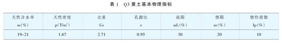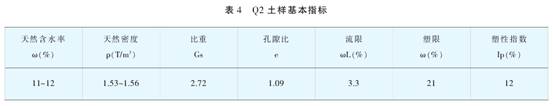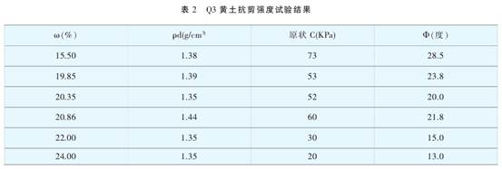 神木縣楊家畔坡村腰觀Q4黃土厚度約1m,Q3黃土厚度約15m,Q2厚度約10m,Ql黃土在溝底露頭3m。管道在腰觀r敷設(shè)長度約60m ,理深約1.2m通過對該腰觀Q3和Q2黃土在不同含水率條件下的土樣進行r物理力學性質(zhì)試驗,Q3和Q2黃土基本物理指標、其不同含水率的抗剪強度、結(jié)構(gòu)強度。和干密度pd的變化關(guān)系見表1-5。