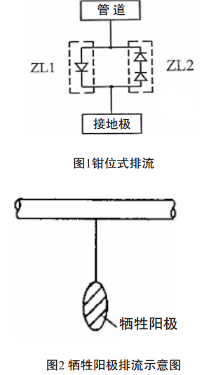 如果將排流接地體直接與管道連接, 由于接地電阻很小, 保護(hù)電流流失, 相當(dāng)大面積的防腐層破壞陰極保護(hù)電流量增加, 以致破壞陰極保護(hù)正常運(yùn)行, 所以需要增加排流節(jié)。 排流節(jié)排流又分為電容排流二極管排流和鉗位式排流, 通常采用鉗位式排流。