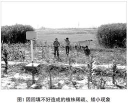 甘州區(qū)堿灘鄉(xiāng)三壩村一社管道穿越農(nóng)田上方的土壤剖面顯示, 地表20cm以下出現(xiàn)石粒、 砂粒和粘土的混合層, 此層硬實度較高, 鐵鍬難以下挖; 而在非管道上方的土壤剖面顯示, 地表以下0-40cm內(nèi)沒有發(fā)現(xiàn)砂石粒層。 這種情況表明油氣管道施工埋管時沒嚴格按照回填順序操作, 將較深層的砂石粘土混合物填在了耕作層中, 限制了玉米根系的生長。 玉米的根系一般分布在0-40cm左右的土層中, 根系的生長受到限制會影響根系的生長發(fā)育, 進而制約水分和養(yǎng)分的吸收。 植物得不到足夠的水分和養(yǎng)分, 生長發(fā)育受到影響,就表現(xiàn)出我們所見到的植株低矮、 稀疏、 發(fā)育滯后等現(xiàn)象(圖1) , 造成作物減產(chǎn)。