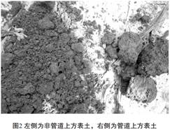 在臨澤縣沙河鎮(zhèn)化音村管道穿越的一農(nóng)戶農(nóng)田, 調(diào)查人員發(fā)現(xiàn)管道上方耕作層的土壤為黑灰色泥炭狀土, 無團粒結(jié)構(gòu), 粘接成塊; 同一地塊非管道上方的耕作層土壤雖也有摻雜的黑色泥炭土, 但土質(zhì)松軟、 團粒結(jié)構(gòu)良好(圖2) 。