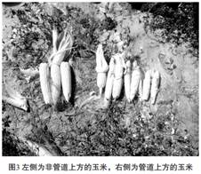 據(jù)農(nóng)田承包者說, 油氣管道上方的地澆水后積水不滲。 調(diào)查組看到, 這里的玉米長得稀疏低矮、 玉米棒小、 嚴重缺粒(圖3) 。
