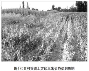 盡管今年雨水充沛, 莊稼長勢普遍好于往年, 但管道上方制種玉米等農(nóng)作物受損情況仍然較為明顯。 現(xiàn)場觀察到的主要現(xiàn)象為植株相對周邊普遍矮小, 結(jié)實率低、 甚至不結(jié)實; 少數(shù)農(nóng)田地塊水土流失嚴重、 地表嚴重凸凹不平, 植株稀疏、 過早枯萎; 有的甚至無法耕種。 管道運行時間最長的已經(jīng)10年, 最短的也有3年, 原因依然來自施工和運行2個方面。