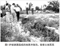 臨澤縣沙河鎮(zhèn)何家莊村二社, 因管道施工修建的攔水垻護坡滲漏, 造成某村民2畝多耕地水土流失嚴重, 地表塌陷, 無法利用, 只好棄耕(圖5) 。 去年調(diào)查時我們曾提出建議、 要求施工部門限期修復(fù), 這次去發(fā)現(xiàn)水流沖蝕的溝、 洞還在,而且比去年更嚴重。 據(jù)農(nóng)民和村干部說, 滲漏現(xiàn)象不僅出現(xiàn)在護坡處, 因埋管道時填土不實, 水沿管道滲漏沖蝕, 致使農(nóng)田地表塌陷的現(xiàn)象也常常發(fā)生。