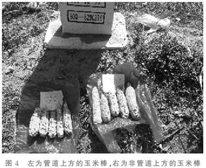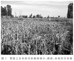 經(jīng)對(duì)孕穗期制種玉米(母本)實(shí)地測(cè)定,管道上方的玉米出苗差,缺苗斷壟現(xiàn)象較嚴(yán)重,株高比正常植株矮,生育期比正常推遲(見(jiàn)圖3);對(duì)管道上方的蕃茄和向日葵測(cè)定,蕃茄未發(fā)現(xiàn)受影響,向日葵表現(xiàn)株高增高,生育期提前。