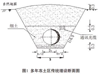 對于多年凍土區(qū)的富冰凍土地段,通過增加管材壁厚能克服多年凍土區(qū)差異性變形對管道帶來的凍害,采取傳統(tǒng)敷設方式。管道敷設斷面圖如圖1所示。