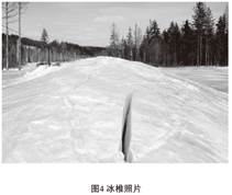 漠大管道出現(xiàn)過較大冰錐,并且成長很快,3天內(nèi)管道上方的冰面升高了約50cm,最高處相對于自然地面隆起約2.9米,表面冰層厚度約150cm,冰椎如圖4所示,地表裂紋嚴重。