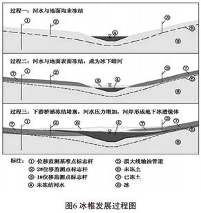 1)管體周圍冰椎、冰丘的形成使管道產(chǎn)生應力彎曲,如果發(fā)生在管道底部,對管道危害更大,嚴重會使管道發(fā)生斷裂。
