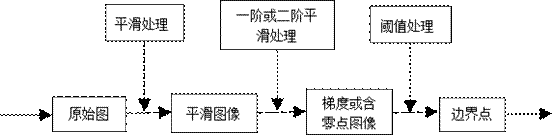 邊緣檢測(cè)處理流程如圖2所示。原始圖像經(jīng)平滑處理后,平滑圖像再經(jīng)一階或二階平滑處理,得到梯度或含零點(diǎn)圖像,再經(jīng)閾值處理,確定邊界點(diǎn)。邊緣即圖像中灰度發(fā)生急劇變化的區(qū)域,可以通過(guò)求解一階導(dǎo)數(shù)或二階導(dǎo)數(shù)檢測(cè)出圖像中灰度不連續(xù)區(qū)域,即邊緣區(qū)域。二值化之后的圖像只存在0和255兩種灰度值,通過(guò)求取一階導(dǎo)數(shù)最大值便可檢測(cè)出其邊界。