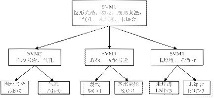 分類(lèi)器構(gòu)造應(yīng)優(yōu)先采用類(lèi)別差異性排除法,即在整體結(jié)構(gòu)中,先將相似量作為一類(lèi),然后根據(jù)相似量之間的細(xì)微變化,再通過(guò)模型算法進(jìn)行區(qū)分。這種分類(lèi)在分類(lèi)準(zhǔn)確率和平衡準(zhǔn)確率上都有極高的效率。本文構(gòu)造了6種缺陷,裂紋、圓形夾渣、條形夾渣、氣孔、未焊透、未熔合等典型缺陷SVM多類(lèi)分類(lèi)器(圖4)。