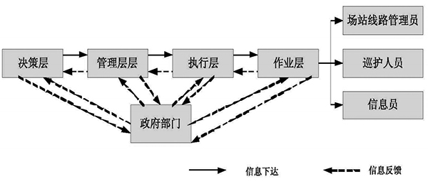 為滿足管道完整性管理的需要,西氣東輸贛湘管理處建立了完整性管理信息傳遞流程, 企業(yè)內(nèi)部設(shè)立了五個(gè)層級(jí), 并且將管道沿線政府部門納入流程之中, 從而使企業(yè)內(nèi)部之間、企業(yè)與與外部之間形成了較為完整的信息下達(dá)與反饋鏈條。 如圖1所示。