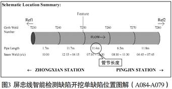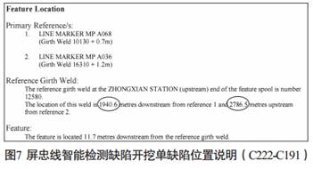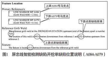 筆者以2008年8月的屏忠線檢測數(shù)據(jù)生成的一張缺陷開挖單舉例做簡單說明。 見圖1, 上游A084號馬克點(diǎn)在6680號環(huán)焊縫下游2.4米處, 下游A079號馬克點(diǎn)在7630號環(huán)焊縫下游6.1米處, 兩點(diǎn)間距為748.2米(495.8米+252.4米) , 上游點(diǎn)距離缺陷點(diǎn)較近的7250焊口495.8米, 下有點(diǎn)距離缺陷點(diǎn)較近的7250焊口252.4米。 那我們使用皮尺從下游點(diǎn)往上游點(diǎn)測量前進(jìn)252.4米, 就是7250焊縫位置, Feature中的“0.0metres”表示缺陷與7250焊縫的距離是0米, 這說明缺陷就在焊縫上。