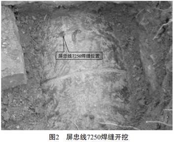 完成7250位置測量后, 垂直于水平面進(jìn)行開挖, 如圖2, 發(fā)現(xiàn)焊縫。