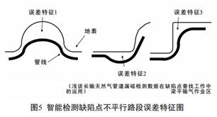 當(dāng)?shù)乇淼孛媾c管道走向不平行, 相對位置不穩(wěn)定的時(shí)候, 誤差就出現(xiàn)了。 這是我們在測量定點(diǎn)過程中一直都存在的情況, 這種測量誤差無處不在。 如圖5, 圖中是三種最常見的因地形造成的測量誤差特征。 如特征1, 地面的曲率半徑小于管道的曲率半徑, 在地面拱起部分隨管道走向的地面測量長度大于該處管道長度。 如特征2, 管道從陡坡過渡到平行路段, 管道有一個(gè)彎頭漸變的過程, 該處隨管道走向的地面測量長度小于該處管道長度, 如特征3, 管道在懸崖陡坡頂端或爬坡頂端, 管道從陡坡過渡到平行路段, 也有一個(gè)彎頭漸變的過程, 該處隨管道走向的地面測量長度大于該處管道長度。