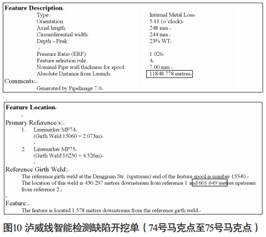 圖8中缺陷的管線里程為1002.808米, 通過列表查看我們發(fā)現(xiàn), 在里程為1023.097處有一處40°彎頭(Bend 40 Deg) , 彎頭方向?yàn)槌掠畏较蛏蠌潱?這個(gè)彎頭可能處于一個(gè)明顯爬坡點(diǎn)。 我們可以從64號馬克點(diǎn)朝上行進(jìn)70米左右(注: 92.728米減去(1023.097-1002.808)米) , 會(huì)很明顯的發(fā)現(xiàn)彎頭, 直接對彎頭進(jìn)行開挖, 找到彎頭上游方向 0 . 4 8米處里程為1023.617米的焊縫(twin seamwelded start) ,從焊縫處朝上游方向準(zhǔn)確測量20.809米, 直接開挖, 缺陷點(diǎn)準(zhǔn)確找到。