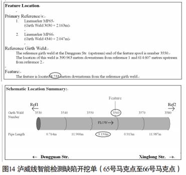 如圖 1 4, 缺陷點(diǎn)距上下游馬克點(diǎn)分別是390.963米和614.607米。 缺陷點(diǎn)位于3560號焊縫周邊。
