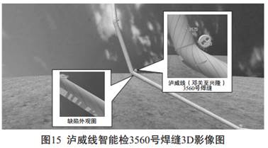 如圖15, 我們通過該管道的3D影像明顯的看到了焊縫3560處的彎頭。 經(jīng)驗(yàn)豐富、 對管道現(xiàn)場熟悉的管護(hù)工可以不進(jìn)行任何測量就直接找到位于山坡上的彎頭。 找到鏈接彎頭的3560號焊縫后, 結(jié)合圖14, 從焊縫朝上游準(zhǔn)確測量焊縫0.377米(9.13-8.753) 就是缺陷點(diǎn)。