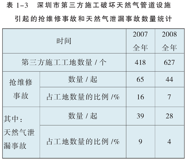 表1-3為深圳市第三方施工破壞天然氣管道設(shè)施引起的搶維修事故和天然氣泄漏事故數(shù)量統(tǒng)計(jì)。從中可以看出來,第三方施工對天然氣管道的安全運(yùn)營有很大的影響。第三方施工造成的天然氣泄漏事故兒乎占到了施工總數(shù)的10%。