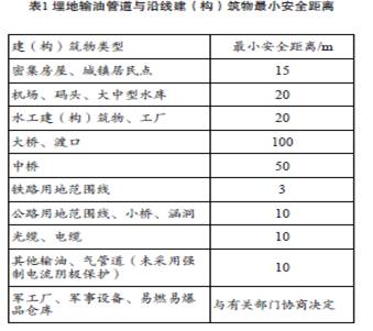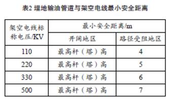 油氣管道沿線難免會有鐵路、公路、房屋等建(構(gòu))筑物,不同類型的建(構(gòu))筑物與管道的最小安全距離不同,相關(guān)標(biāo)準(zhǔn)除上述提到的兩項(xiàng)之外,還包括:《埋地鋼質(zhì)管道陰極保護(hù)技術(shù)規(guī)范GB/T 21448—2008》《鋼質(zhì)管道外腐蝕控制規(guī)范GB/T 21447—2008》《關(guān)于處理石油管道和天然氣管道與公路相互關(guān)系的若干規(guī)定(試行) 》《原油、天然氣長輸管道與鐵路相互關(guān)系的若干規(guī)定》《110~500kV 架空送電線路設(shè)計技術(shù)規(guī)程》(DL/T 5092—1999)。埋地原油、成品油管道與沿線建 (構(gòu))筑物安全距離如表1所示,管道與沿線高壓電力線安全距離如表 2 所示,敷設(shè)在地面的輸油管道與沿線建(構(gòu))筑物安全距離應(yīng)按表 1、表 2所示加倍。