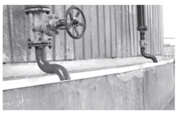 (3)在消防管線立管末端上安裝一個彎頭, 使消防管線內(nèi)的水排放在散水外邊,防止水溢流在罐體散水上,確保散水水泥板的完好(圖8)。