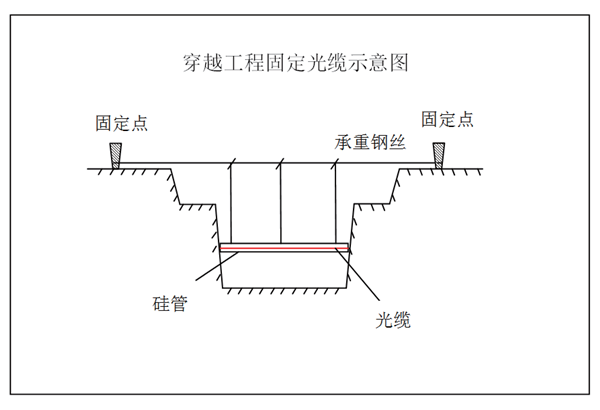 交叉工程施工是威脅光纜安全的重要因素, 穿越工程由于施工過程需將光纜懸空,風(fēng)險(xiǎn)最高。施工前應(yīng)采用人工開挖精確定位光纜位置,待光纜懸空后套硅管進(jìn)行保護(hù),并在穿越段溝坡上方設(shè)置固定點(diǎn)綁扎承重鋼絲做支撐,再將光纜懸吊在承重鋼絲上。這樣做的目的是減輕光纜自身重力影響及緩沖重物掉落光纜所受應(yīng)力。光纜距離管道較近時(shí),可將光纜直接固定在管道上更安全。