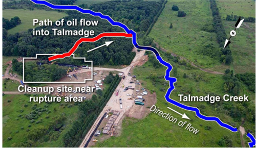 其五,6B管線破裂泄漏的原油進(jìn)入濕地內(nèi),最終流入Talmadge溪與Kalamazoo河。Enbridge公司早期采取的響應(yīng)行動(dòng)集中在破裂點(diǎn)下游。當(dāng)時(shí)的強(qiáng)降雨增大了Talmadge溪與Kalamazoo河的流量,從而加快了原油擴(kuò)散,給應(yīng)急行動(dòng)帶來了困難(見圖2)。響應(yīng)人員由于對周邊環(huán)境不熟悉,沒有在第一時(shí)間采取封堵措施;沒有考慮對泄漏點(diǎn)臨近的涵洞采取攔截措施;也缺乏圍油欄使用知識(shí),在高流速區(qū)域不恰當(dāng)?shù)厥褂昧藝蜋凇?/p>
