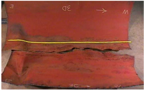 調(diào)查確定,發(fā)生破裂時(shí)管道內(nèi)的運(yùn)行壓力(4.65 MPa)低于該管段規(guī)定的最大允許壓力(5.77 MPa)。管道運(yùn)行由SCADA系統(tǒng)監(jiān)控,雖然調(diào)控中心的控制員受到SCADA系統(tǒng)數(shù)據(jù)短時(shí)中斷以及Pecos河壓縮機(jī)站停電造成SCADA通信失靈的阻礙,沒能在破裂發(fā)生后立即查明Pecos河壓縮機(jī)站迅速惡化的情況,但是,該控制員根據(jù)所獲取的信息及時(shí)做出了妥善回應(yīng)。沒有證據(jù)能夠表明管道破裂處有第三方造成的損傷和外部腐蝕。由此,NTSB認(rèn)為下列情況未對(duì)事故或其后果起到推動(dòng)作用:管道壓力過大、SCADA通信中斷或缺失、挖掘等活動(dòng)對(duì)管道造成的外部損傷以及外部腐蝕。