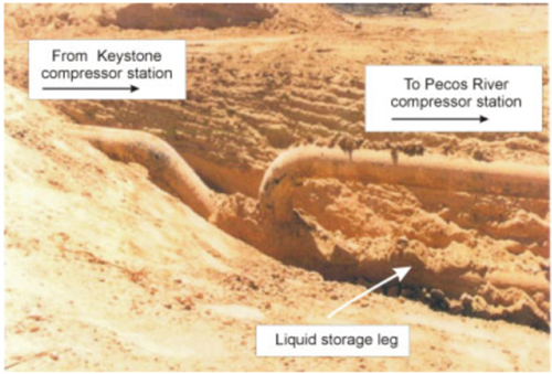 2000年8月19日5:26,新墨西哥州Carlsbad市Pecos河附近天然氣管道發(fā)生破裂泄漏,隨即爆炸著火,并持續(xù)燃燒了55分鐘。管道發(fā)生破裂前,有12人在破裂點(diǎn)附近的一座支撐管道跨河的混凝土鋼橋下露營。事故發(fā)生后,12人全部喪生,他們的3部車輛也被燒毀。附近2座支撐輸氣管道跨河的鋼吊橋大面積受損。發(fā)生事故的管道編號(hào)1103,直徑762 mm,由El Paso能源公司的子公司EPNG公司運(yùn)營,EPNG公司運(yùn)營超過1600 km天然氣輸送管道、59個(gè)壓縮機(jī)站、300多個(gè)壓縮機(jī)組,4條Pecos河穿跨越管道中的3條在役管道。 此次事故造成的財(cái)產(chǎn)及其它損失共計(jì)998 296美元。國家運(yùn)輸安全委員會(huì)(NTSB)調(diào)查認(rèn)為,天然氣管道發(fā)生破裂的主要原因是管道存在嚴(yán)重的內(nèi)部腐蝕,管壁變薄致無法承受內(nèi)壓所致。而之所以發(fā)生嚴(yán)重的內(nèi)腐蝕是由于EPNG公司沒有制定切實(shí)可行的防腐計(jì)劃,也沒有有效排查和控制公司所轄管道發(fā)生內(nèi)部腐蝕的措施。另外,聯(lián)邦研究與特別項(xiàng)目管理處在事故前對(duì)EPNG公司進(jìn)行的檢測(cè)也沒能發(fā)現(xiàn)其內(nèi)部防腐計(jì)劃的不足,這說明監(jiān)管檢查也存在一定的漏洞。