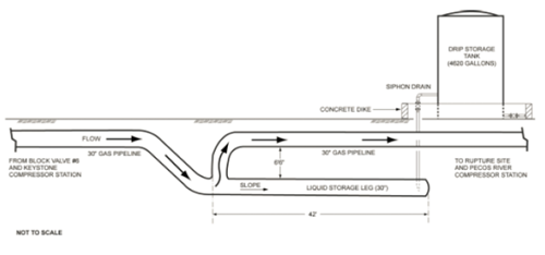 1975年,在距離Keystone壓縮機(jī)站下游/以西16.9 km的2號(hào)截?cái)嚅y上安裝了發(fā)球裝置,在6號(hào)截?cái)嚅y上安裝了收球裝置。事故發(fā)生時(shí),從2號(hào)截?cái)嚅y到6號(hào)截?cái)嚅y間可以進(jìn)行正常清管作業(yè),清除積累在管道中的固體和液體。清管作業(yè)周期為每年至少2次。