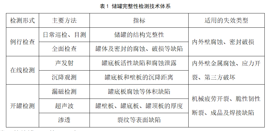 儲(chǔ)罐完整性評(píng)價(jià)包括三個(gè)方面,即完整性檢測(cè)、剩余壽命預(yù)測(cè)和沉降變形評(píng)估。檢測(cè)技術(shù)是完整性評(píng)價(jià)的關(guān)鍵。儲(chǔ)罐的完整性檢測(cè)包括日常巡檢、全面檢查、技術(shù)性檢測(cè)和開(kāi)罐檢測(cè)四個(gè)方面(見(jiàn)表1)。日常巡檢和全面檢查主要是通過(guò)視覺(jué)觀察的方法,檢查是否有損壞的罐體結(jié)構(gòu);技術(shù)性檢測(cè)是在不停產(chǎn)的情況下進(jìn)行的在線(xiàn)檢測(cè),檢測(cè)技術(shù)主要有聲發(fā)射檢測(cè)、沉降觀測(cè)等;開(kāi)罐檢測(cè)技術(shù)有漏磁檢測(cè)、超聲波、射線(xiàn)、磁粉和滲透等[1]。