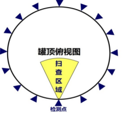 超聲導(dǎo)波檢測(cè)是利用超聲高頻導(dǎo)波成像檢測(cè)技術(shù),將導(dǎo)波探頭放置在壁板外的底板延接板上,以罐底板作為超聲導(dǎo)波傳導(dǎo)體,借助導(dǎo)波技術(shù)的物理特性,快速發(fā)現(xiàn)罐內(nèi)底板上下表面腐蝕等壁厚突變信號(hào)。配合聲定位技術(shù)使用,可實(shí)現(xiàn)以點(diǎn)帶面的檢測(cè)效果,即通過(guò)罐外底板延接板上的一個(gè)檢測(cè)點(diǎn)來(lái)覆蓋一個(gè)扇形掃查區(qū)域,檢測(cè)非常具有代表性。如圖13所示。