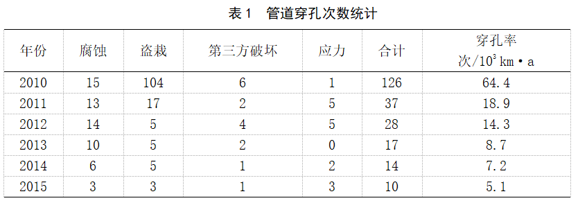 推行管道完整性管理后,管道穿孔次數(shù)逐年下降,綜合穿孔率從64.4次/103 km·a降低到5.1次/103 km·a,尤其是在預(yù)防腐蝕和盜栽方面效果明顯(見(jiàn)表1)。